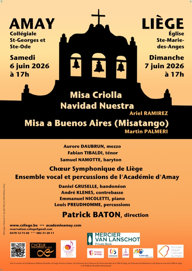 • les 6 et 7 juin : la Misa a Buenos Aires (Misatango) de Martin Palmeri et la Misa Criolla d’Ariel Ramirez, avec des instruments européens et sud-américains et des chanteurs de l’Académie d’Amay : concert donné à Amay et à Liège.